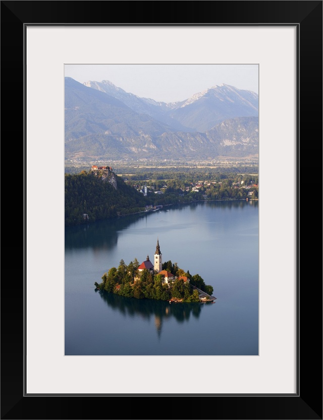 <p>Slovenia, Julian Alps, Upper Carniola, Lake Bled. Aerial view of the island on Lake Bled.</p>