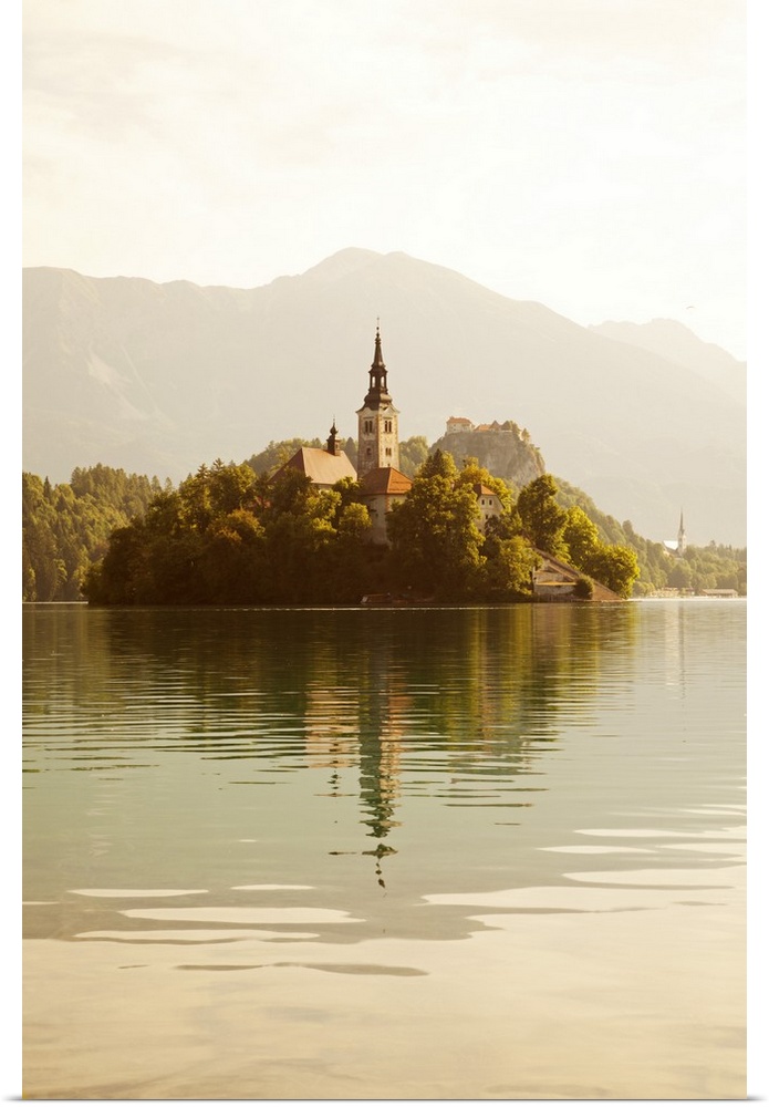 <p>Slovenia, Julian Alps, Upper Carniola, Lake Bled. Morning mist on Lake Bled island and surroundings.</p>