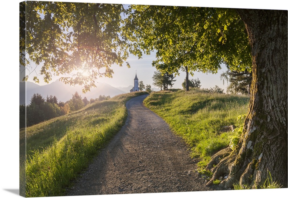<p>Europe, Slovenia. The road leading to the Church of St Primus and Felician in Jamnik at sunrise.</p>