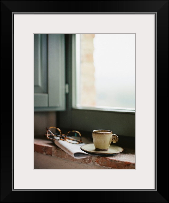 <p>Photograph of a magazine, reading glasses and a cup of coffee on a windowsill, Tuscany, Italy.</p>