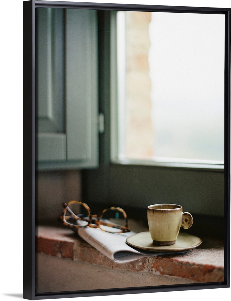 <p>Photograph of a magazine, reading glasses and a cup of coffee on a windowsill, Tuscany, Italy.</p>