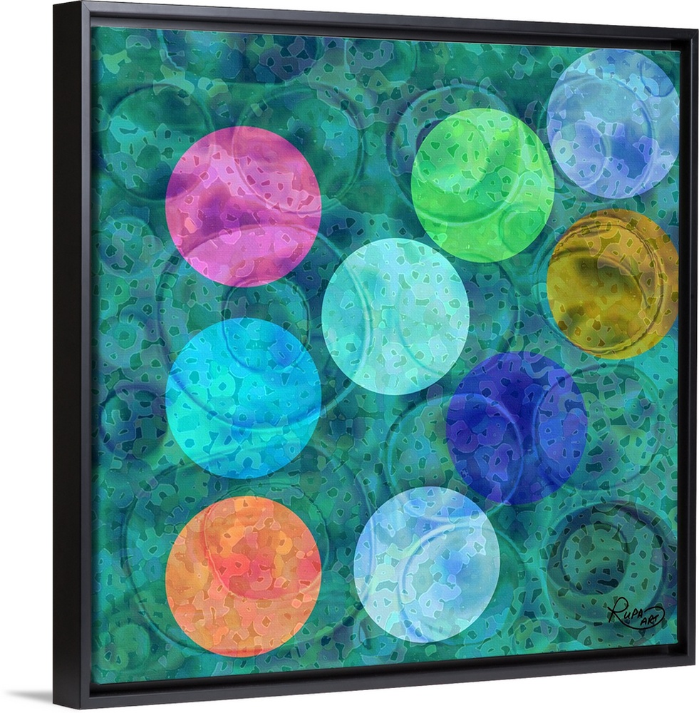 <p>Square abstract art with colorful circular shapes on top of a blue and green background.</p>