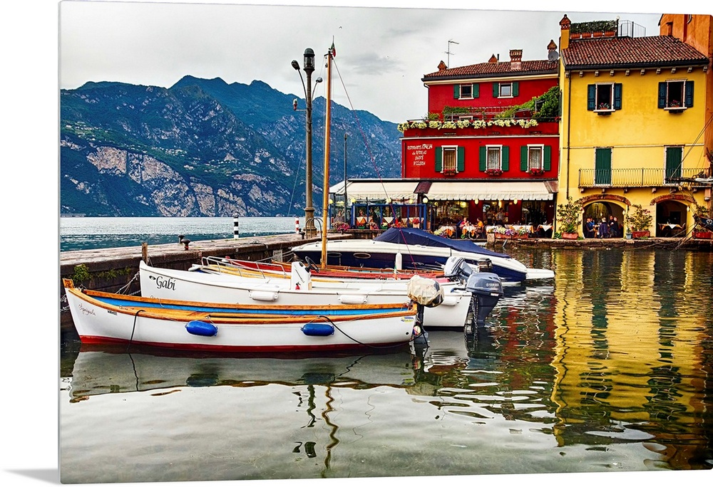 <p>Fine art photo of boats docked in a harbor near brightly painted houses in Italy.</p>