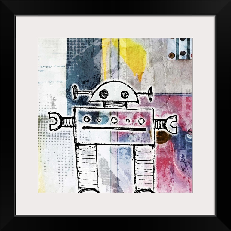 <p>Cute painting of a robot made of simple lines and shapes.</p>