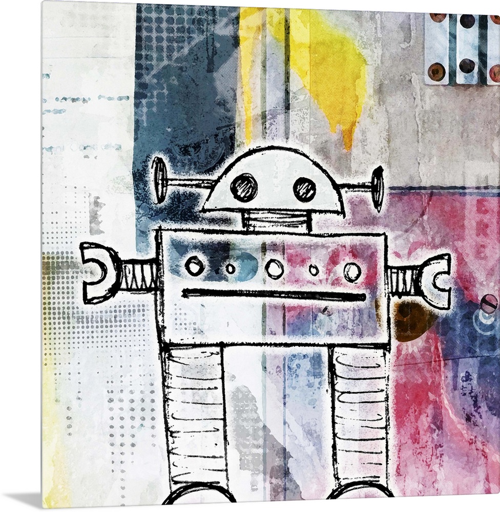 <p>Cute painting of a robot made of simple lines and shapes.</p>