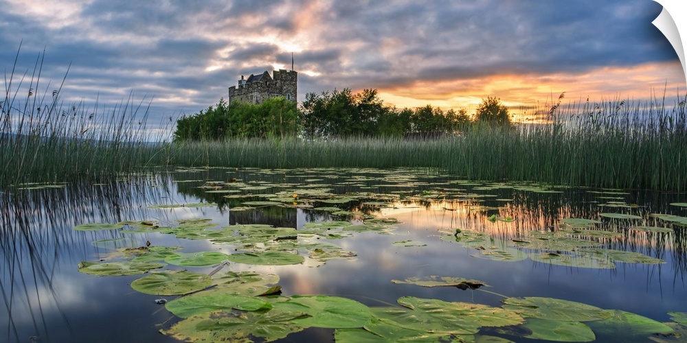 <p>Small castle on an island on Lough Derg at sunrise in summer with lily pads floating on the lake in the foreground; Scariff, County Clare, Ireland.</p>