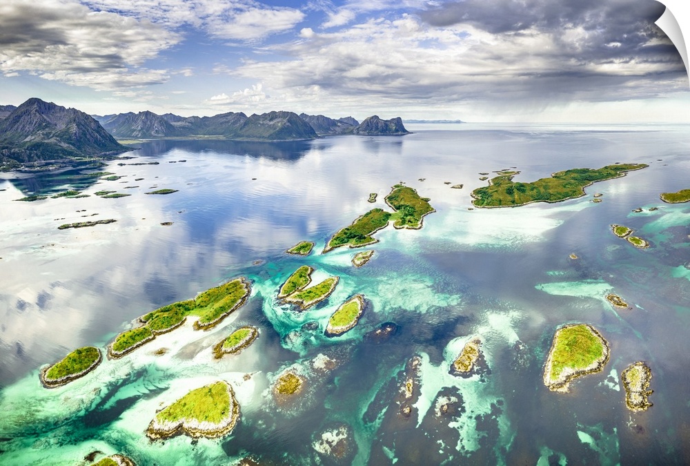 <p>Small idyllic islands of Bergsoyan along the fjord, aerial view, Hamn I Senja, Skaland, Senja, Troms county, Norway.</p>