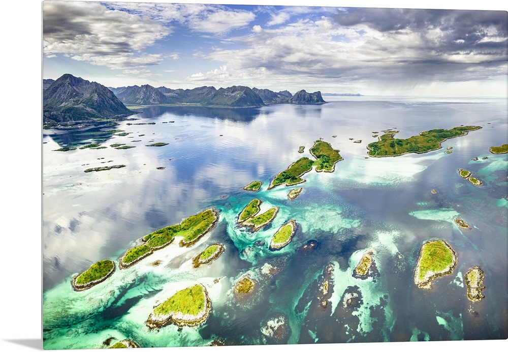 <p>Small idyllic islands of Bergsoyan along the fjord, aerial view, Hamn I Senja, Skaland, Senja, Troms county, Norway.</p>