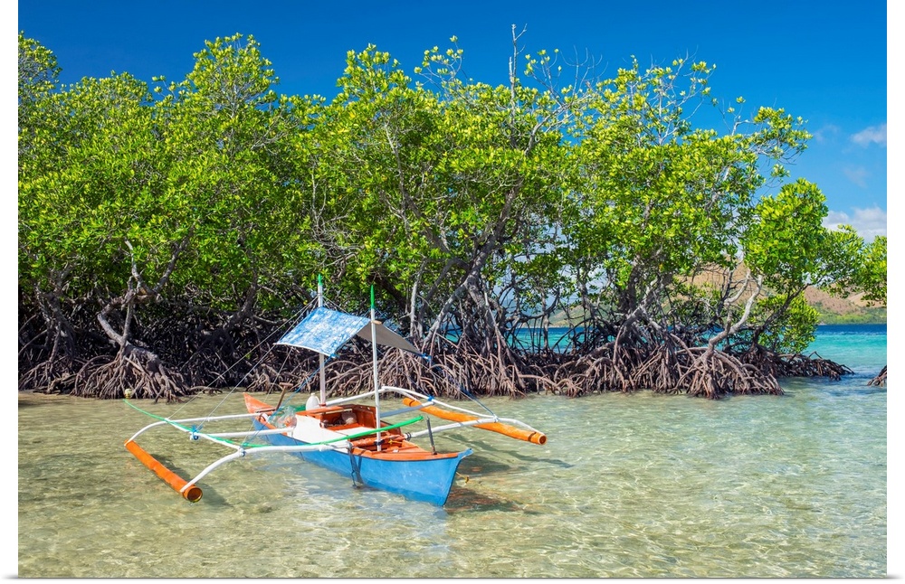 <p>Small outrigger boat and mangrove trees (Rhizophora mangle) on CYC Island, Coron, Palawan, Philippines.</p>