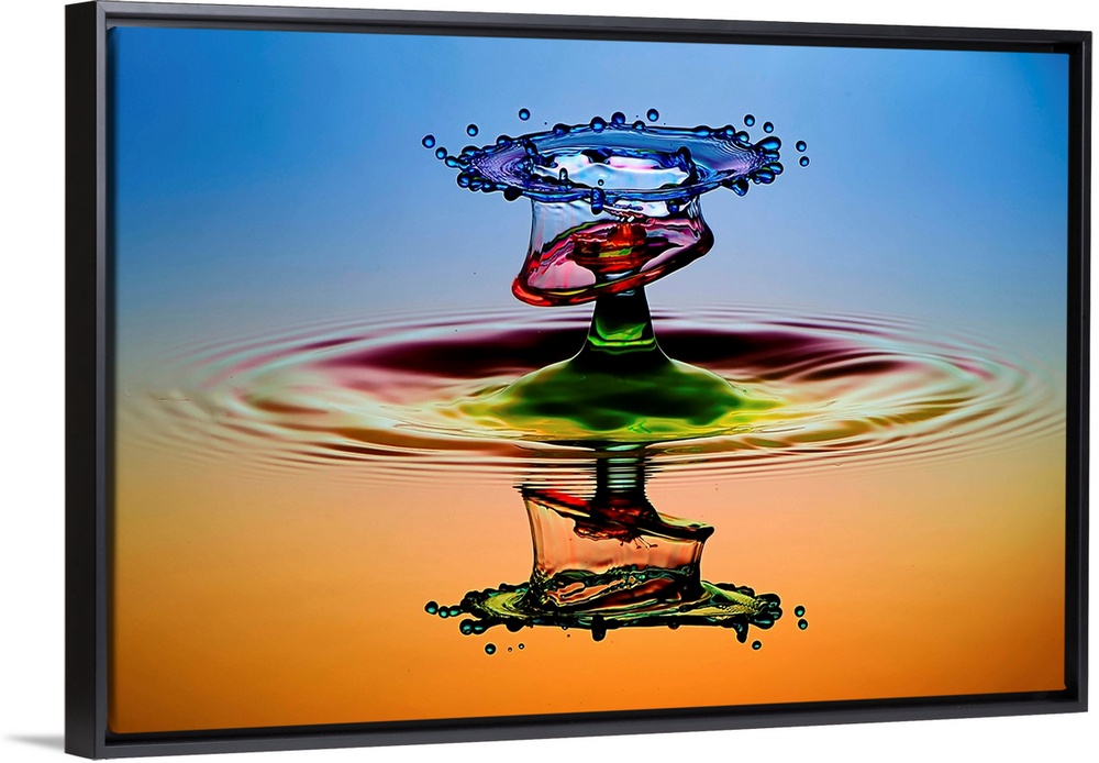 <p>A macro photograph of a tiny water splash caught in mid air and illuminated in vibrant colors.</p>