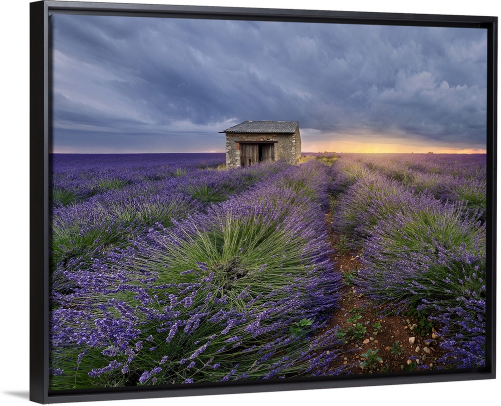 <p>Small stone house in lavender field at sunset with a cloudy sky, Valensole, Provence, France, Europe</p>