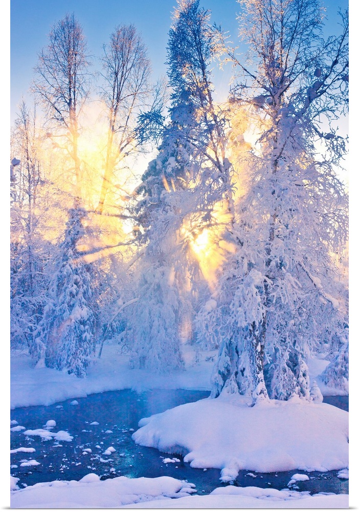 <p>Photo of a stand of Cottonwood trees on an island in the middle of a small stream in a hoarfrost covered forest, rays of sun filtering through the fog in the background, winter, Russian Jack Park, Anchorage, Southcentral Alaska, USA. Digitally Enhanced.</p>