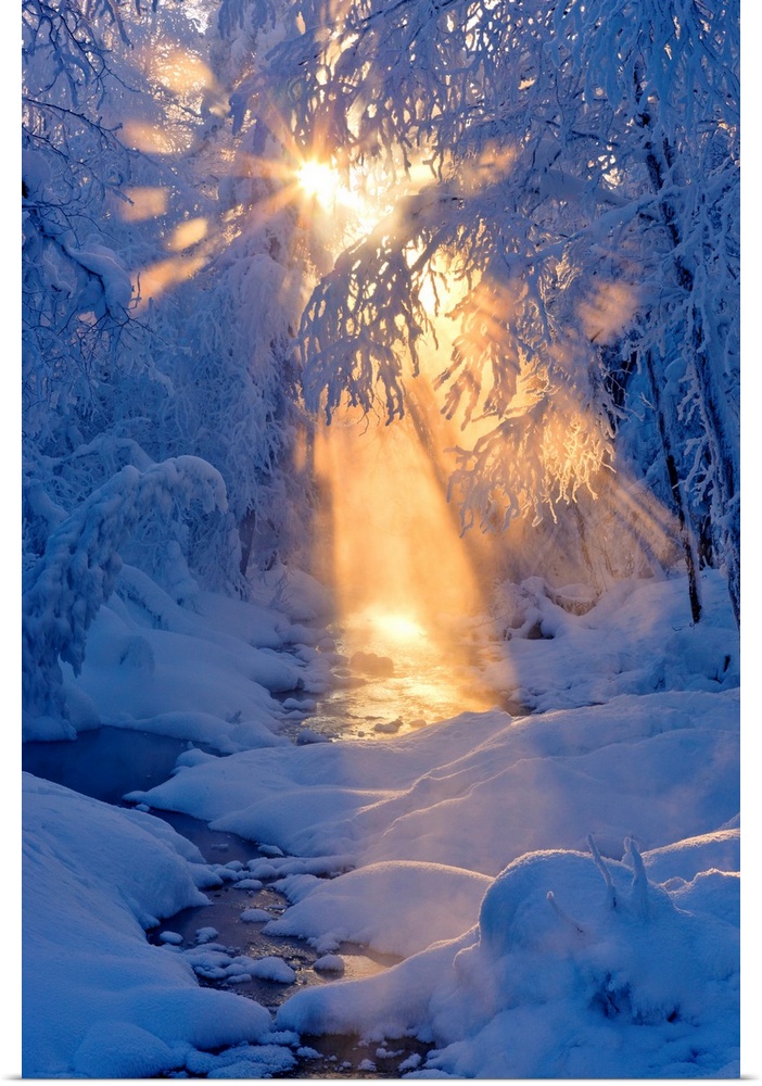 <p>Photo of the rays of sun filtering through the fog next to a small stream flowing through a hoarfrost covered forest, winter, Russian Jack Park, Anchorage, Southcentral Alaska, USA. Digitally Enhanced.</p>