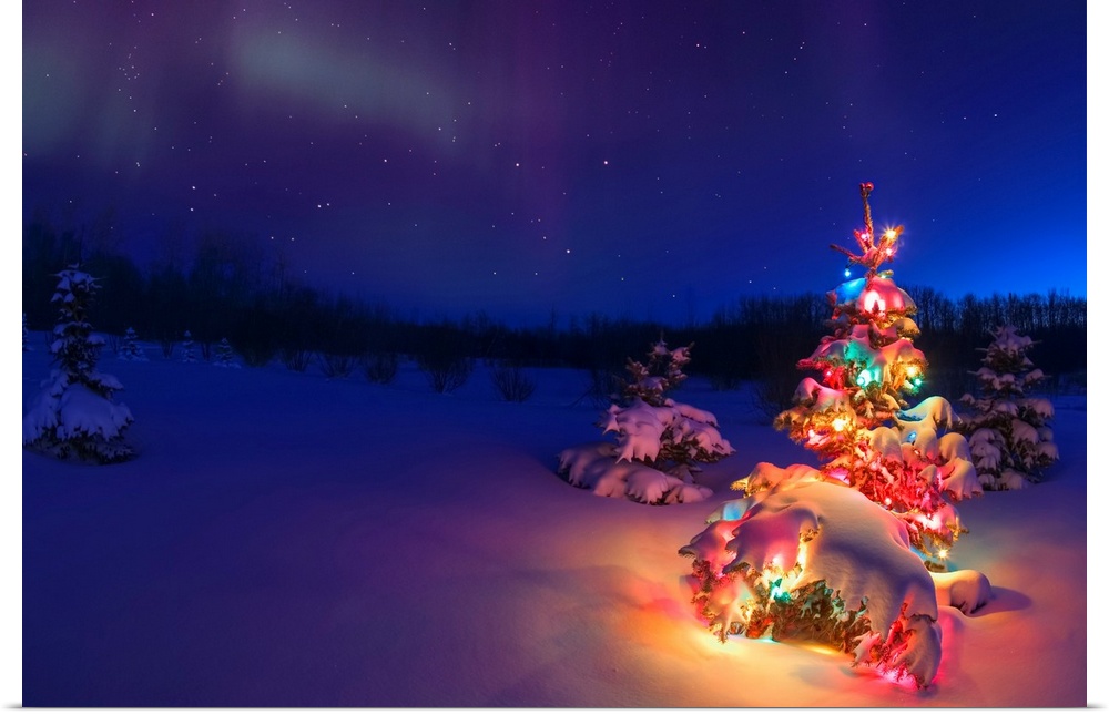 <p>Small tree outdoors with Christmas lights under starry sky, Alberta, Canada.</p>