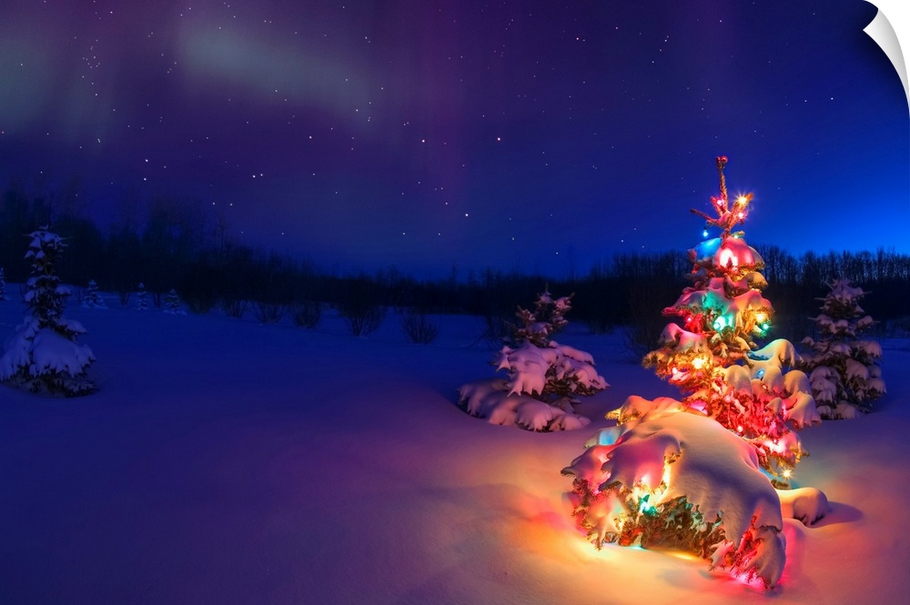 <p>Small tree outdoors with Christmas lights under starry sky, Alberta, Canada.</p>