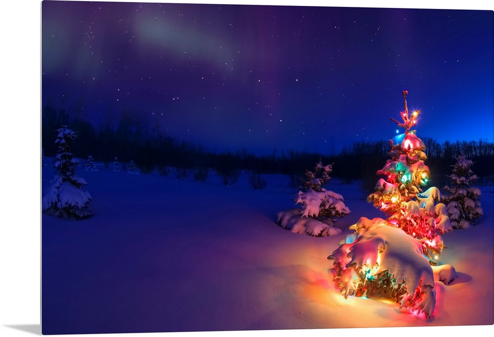 <p>Small tree outdoors with Christmas lights under starry sky, Alberta, Canada.</p>