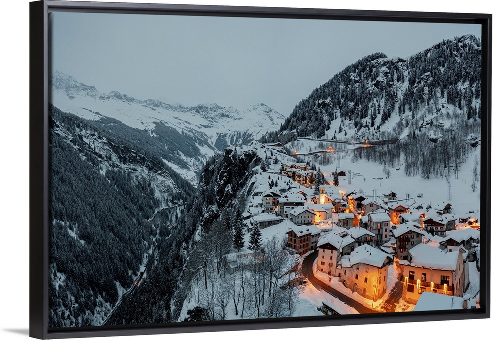 <p>Small village of Pianazzo on top of snowcapped mountain after a snowfall, Madesimo, Valle Spluga, Valtellina, Lombardy, Italy, Europe</p>