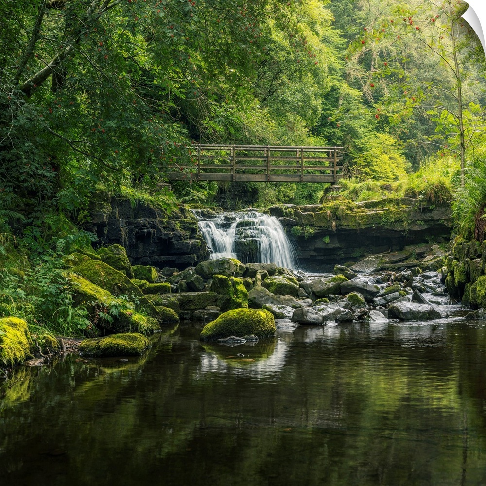 <p>Small waterfall flowing beneath a rustic wooden bridge as it pours over a layered rocky shelf, framed by overhanging trees. Ashgill force, Alston, Cumbria, England.</p>