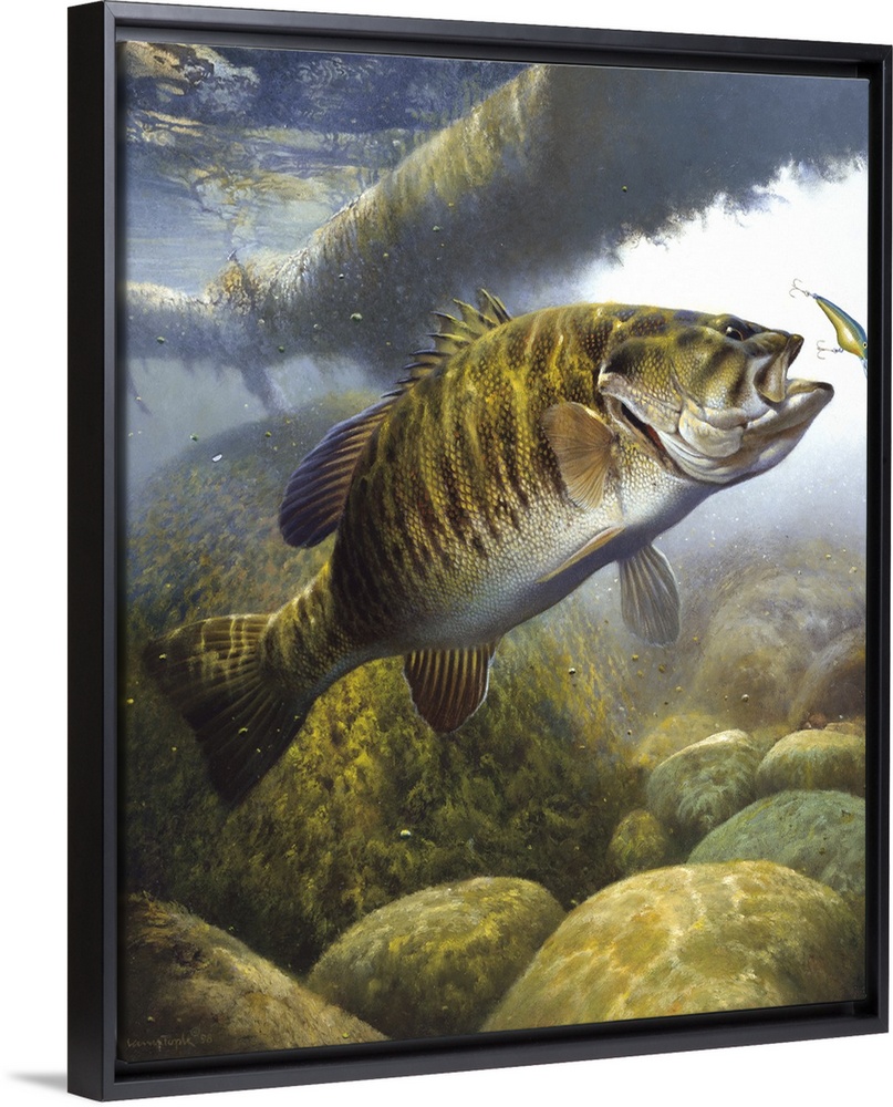 <p>Underwater shot of small mouth bass approaching lure.</p>