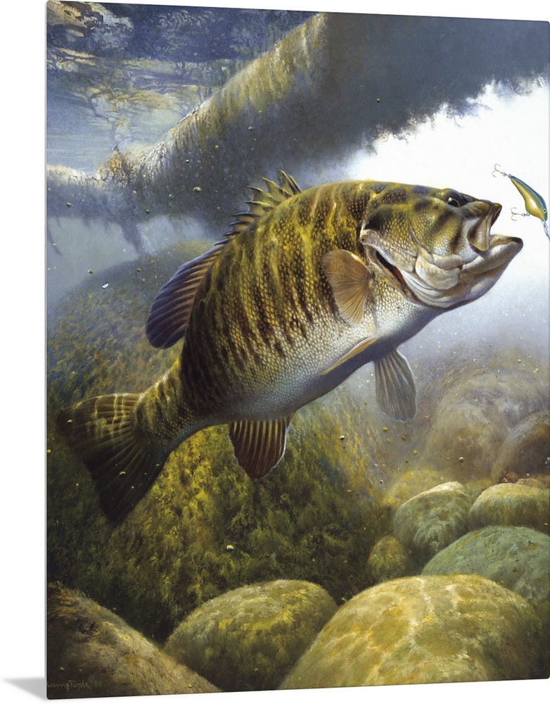 <p>Underwater shot of small mouth bass approaching lure.</p>