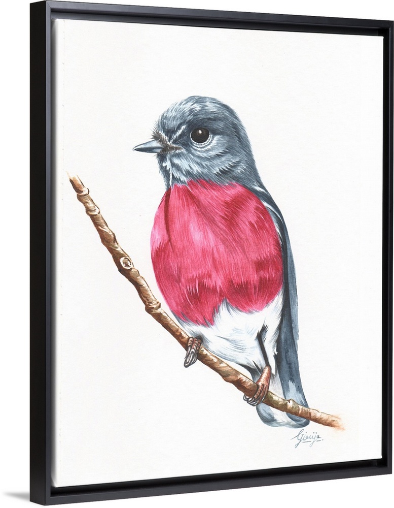 <p>The rose robin is a small passerine bird native to Australia. The male has a distinctive pink breast. Its upperparts are dark grey with white frons, and its tail black with white tips. This pink bird is painted in watercolor on paper.</p>