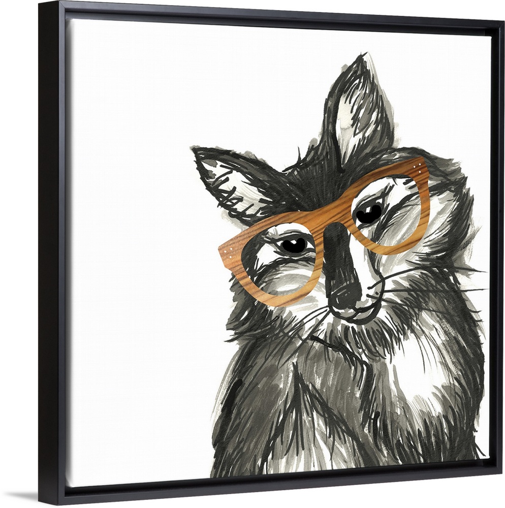 <p>Black and white illustration of a whimsical fox wearing wood grain glasses on a square background.</p>