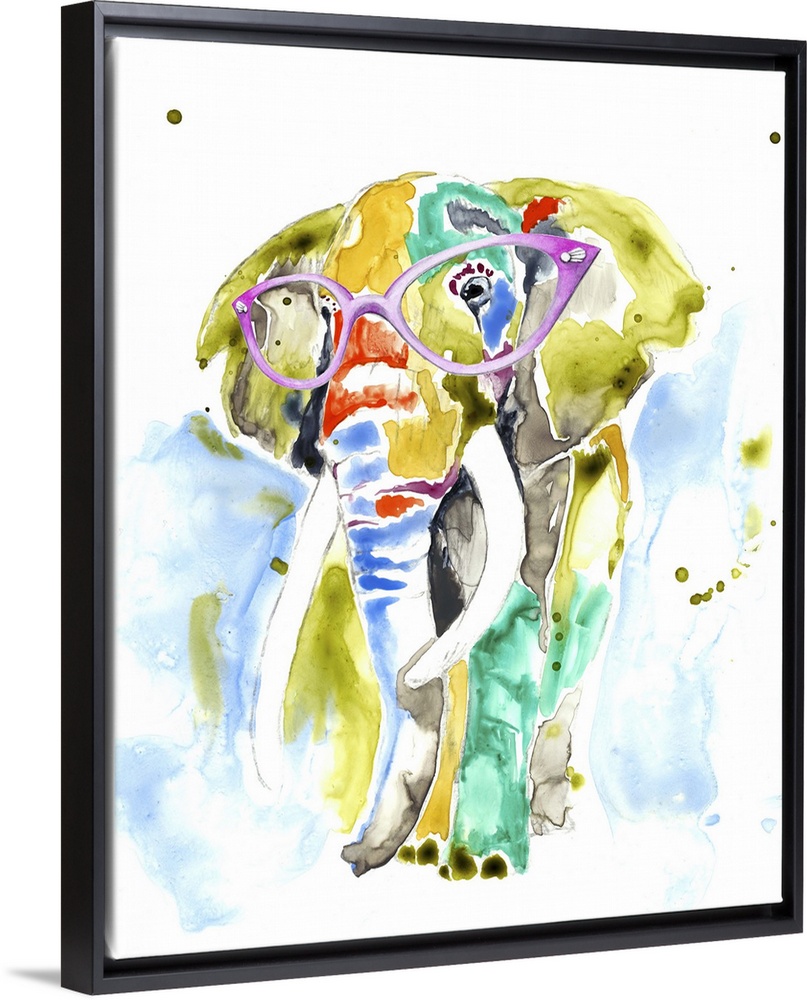 <p>Colorful watercolor painting of an elephant wearing purple rimmed glasses.</p>