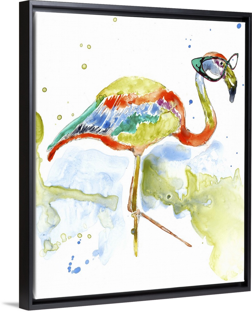 <p>Colorful watercolor painting of a flamingo wearing teal rimmed glasses.</p>