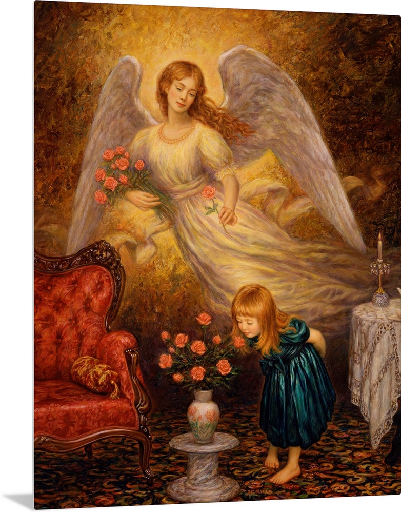 <p>An angel looking over a little girl, dressed in a blue dress, bent over smelling the roses in a vase</p>