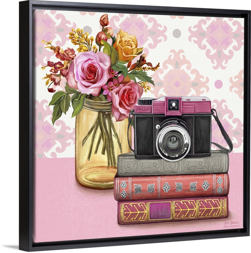 <p>Contemporary vibrant home decor artwork with a pink camera and a bouquet of colorful flowers in a mason jar.</p>