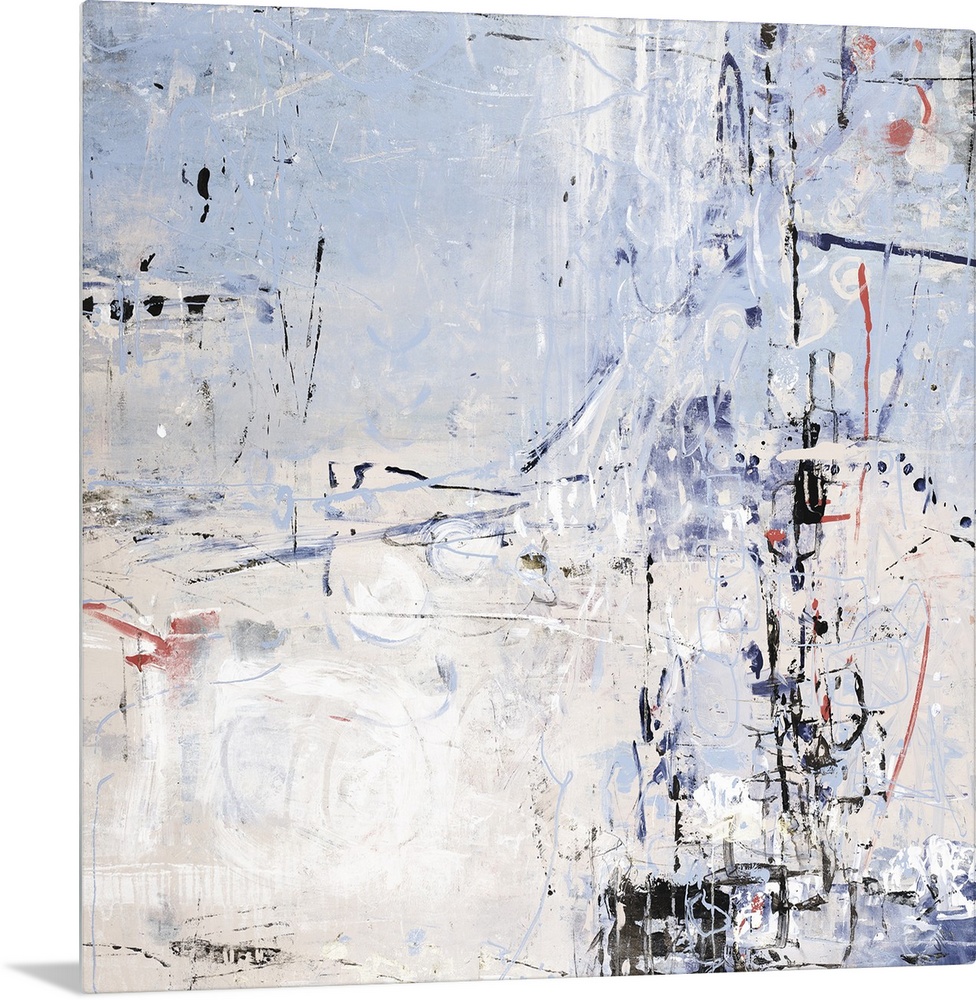 <p>Square abstract painting in shades of blue, white, and black with pops of red through out.</p>