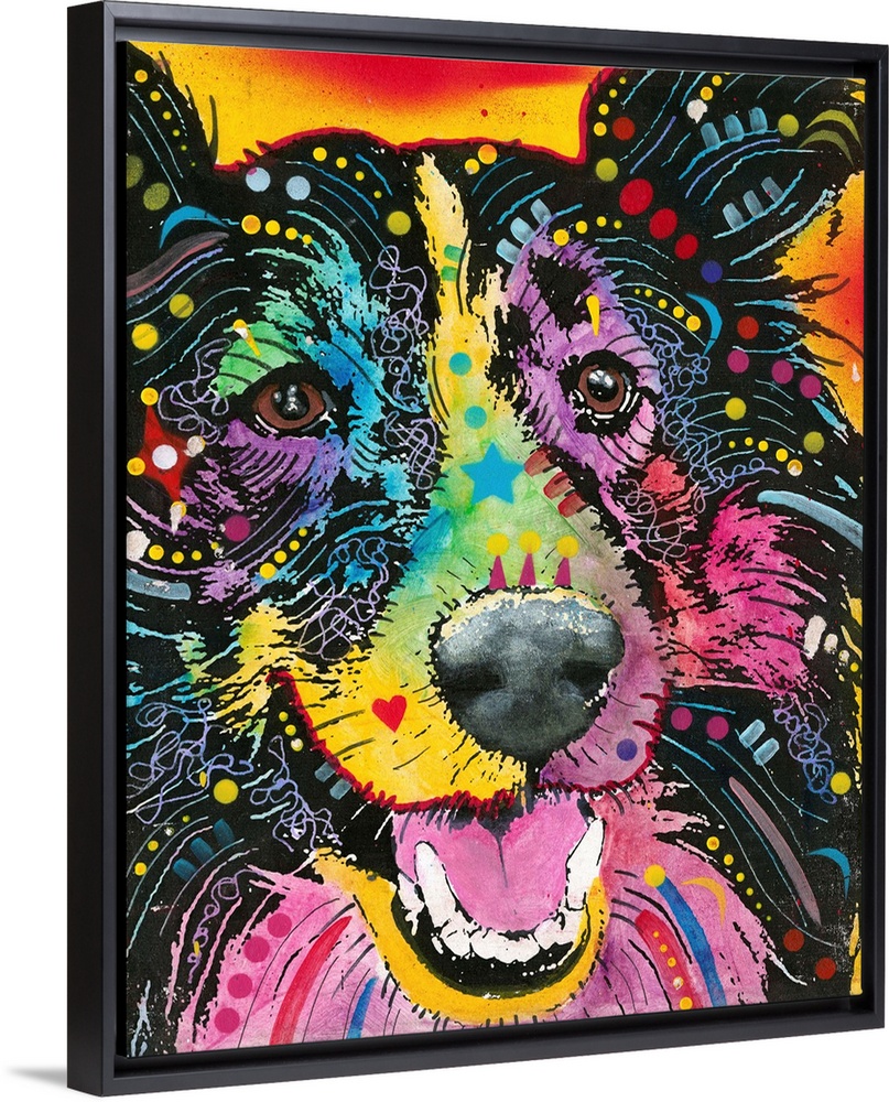 <p>Colorful painting of a smiling Collie dog with geometric designs on a red and yellow background.</p>