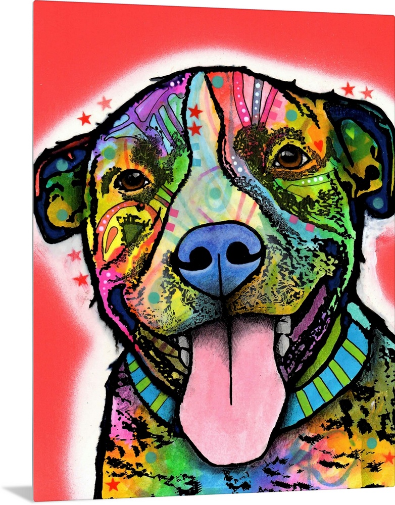 <p>Contemporary stencil painting of a smiling pit bull filled with various colors and patterns.</p>