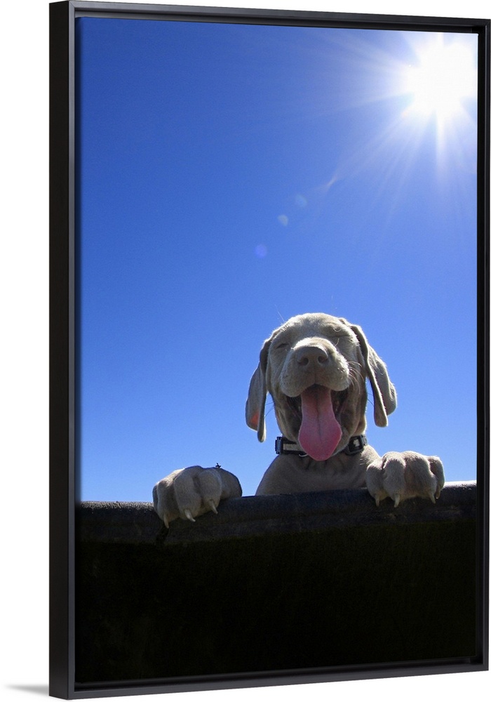 <p>A young weim puppy dog standing behind a fence or in a wheel barrow with paws on top, huge smile with tongue out and eyes closed in bright summer sunlight with sun behind and deep blue sky.</p>