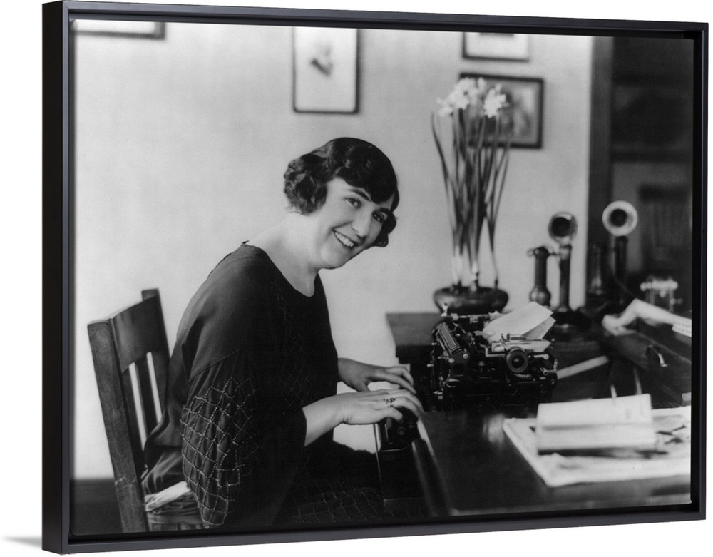 <p>Smiling woman office worker seated at typewriter, in 1923.</p>