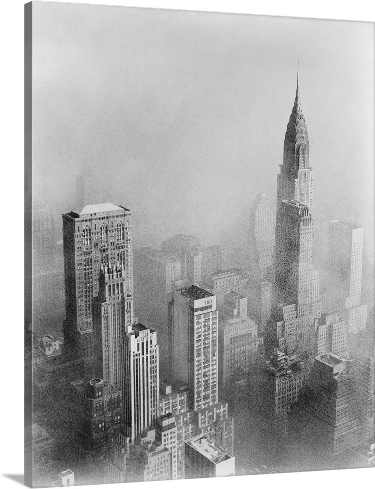 <p>Smog and New York skyscrapers, 1950s. Smog obscuring the view of the Chrysler Building (right) from the Empire State Building, New York City, USA. The Chrysler Building (1930, 319 metres) was the world's tallest building for 11 months before being surpassed by the Empire State Building (1931, 443 metres). Photographed on 20 November 1953 by Walter Albertin.</p>