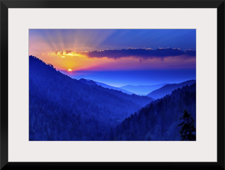 <p>Warm rays of sunlight illuminating the deep blue sky over the Blue Ridge Mountains.</p>