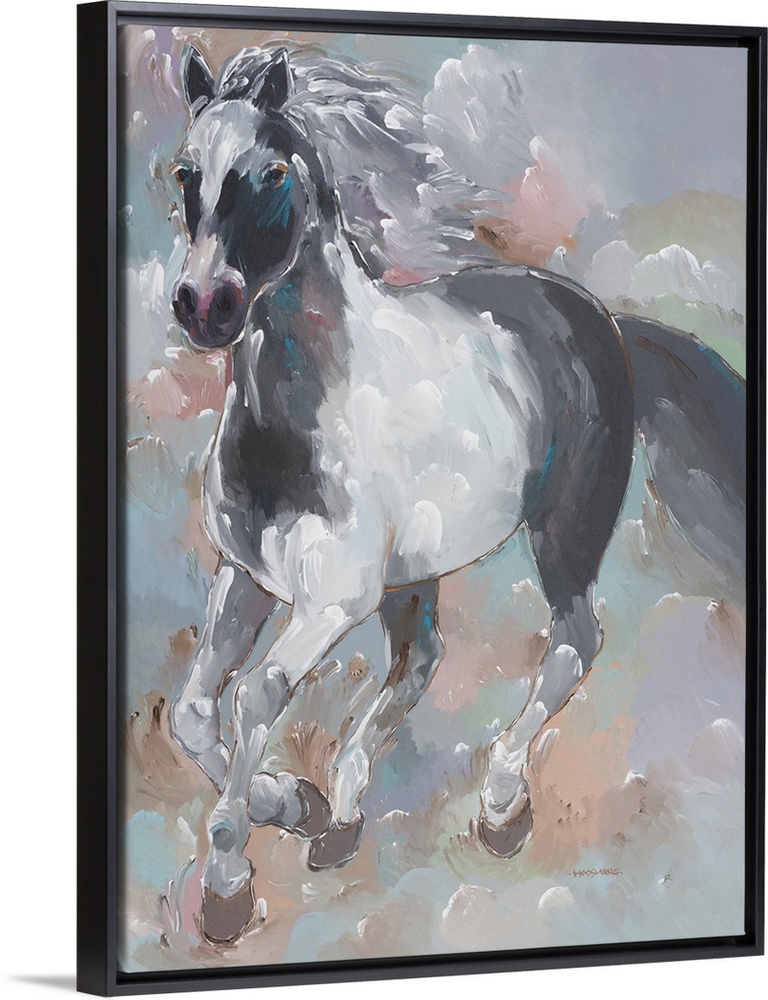 <p>Contemporary painting of a black and white galloping horse with pops of blue on a colorful pastel background.</p>