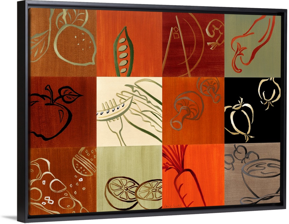 <p>Painting with a grid layout of several different ingredients including garlic, tomatoes, pizza, carrots, apples and peppers, done in simple lines.</p>