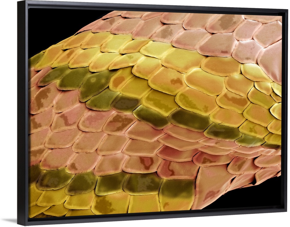 <p>Snake skin, coloured scanning electron micrograph (SEM). The scales of a snake protect it as it moves along the ground or through trees. They vary in size, with larger flat sales on the underside that help gain traction for movement. The scales do not grow and so as the snake grows it sheds its skin to reveal a layer of new, larger scales.</p>