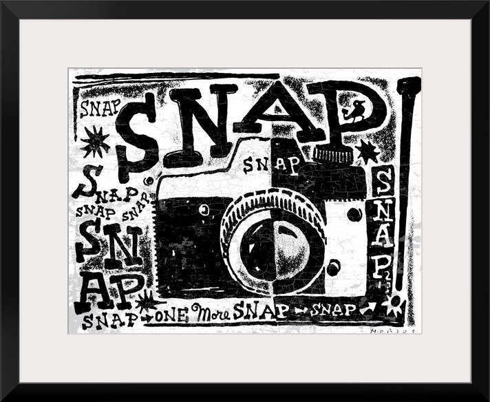 <p>Black and white stylized illustrated camera with the word “Snap!” repeated all over.</p>