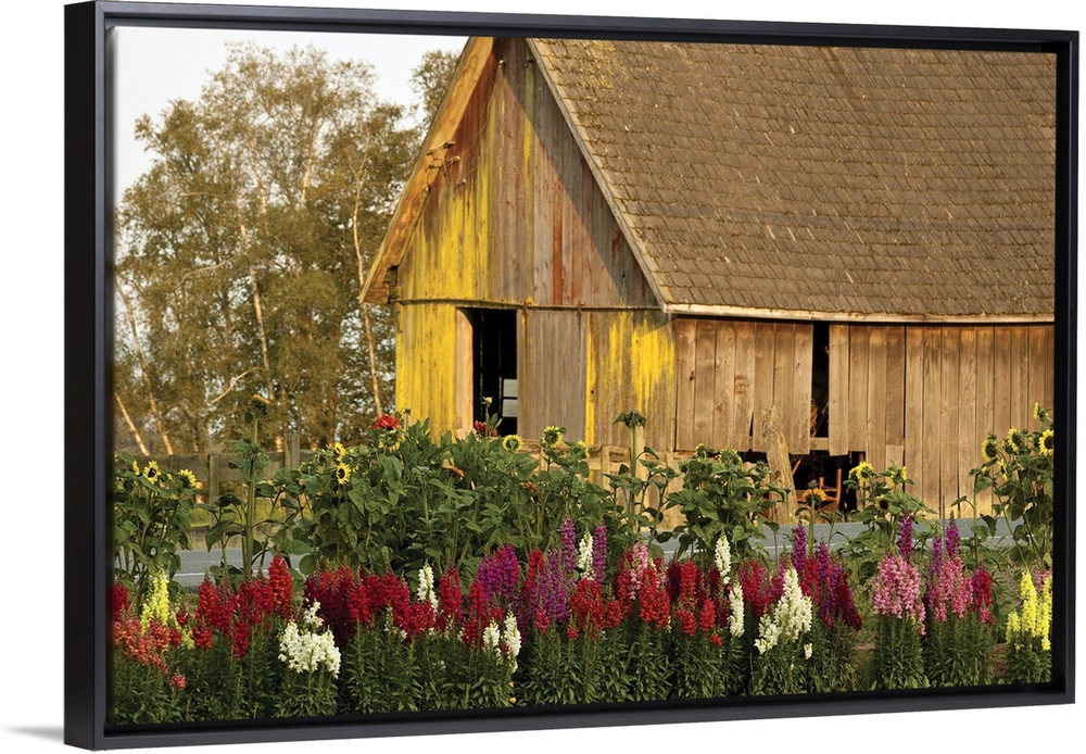 <p>A rustic and weathered barn with peeling paint is surrounded by landscaped rows of flowers in his summer inspired photograph.</p>