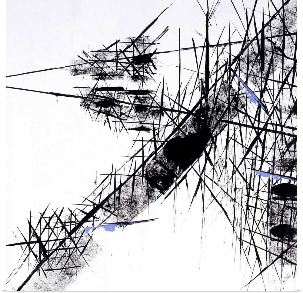 <p>Abstract painting of black lines with smaller crossing lines and subtle blue accents.</p>