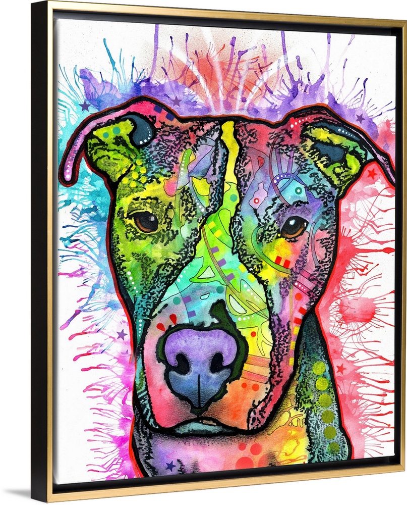 <p>Contemporary stencil painting of a pit bull filled with various colors and patterns.</p>