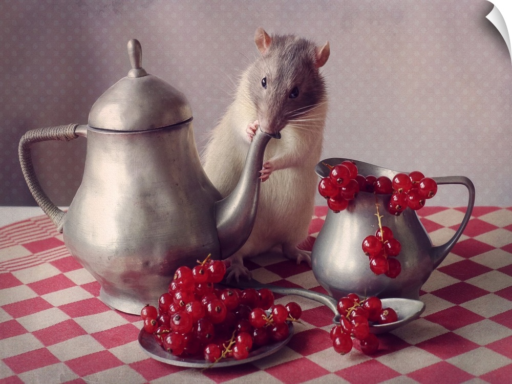 <p>A conceptual still-life photograph of a rat with a teapot and fruit.</p>