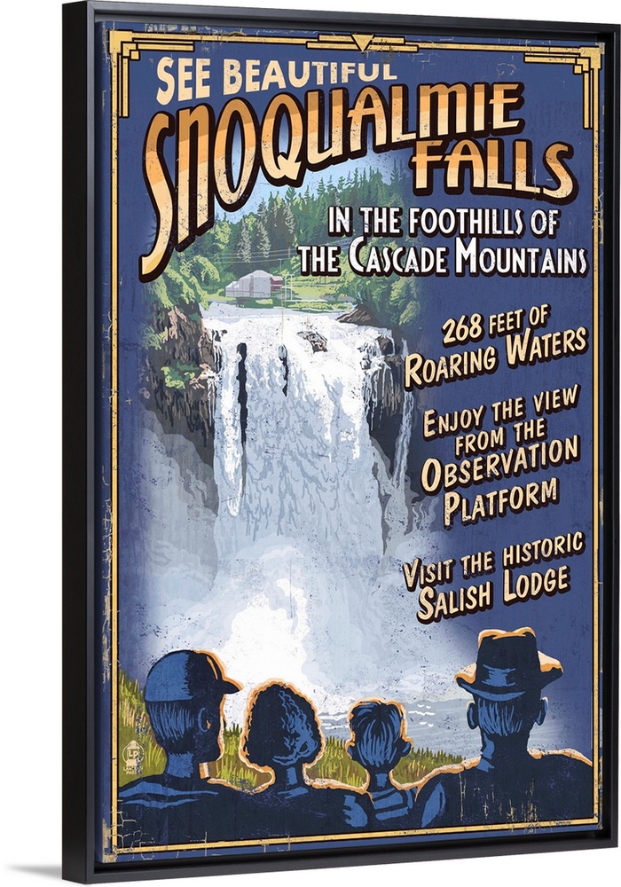 <p>Retro stylized art poster of a group of people looking at a waterfall.</p>