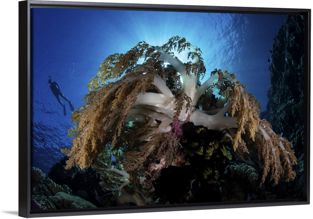 <p>A snorkeler swims above soft corals growing on a reef near Alor in the Lesser Sunda Islands.</p>