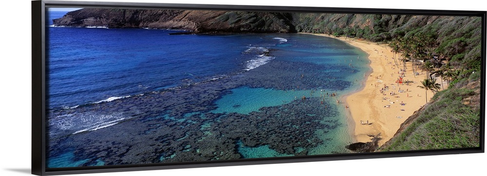 <p>Panoramic photograph of inlet with coral and beach lined with mountains.</p>