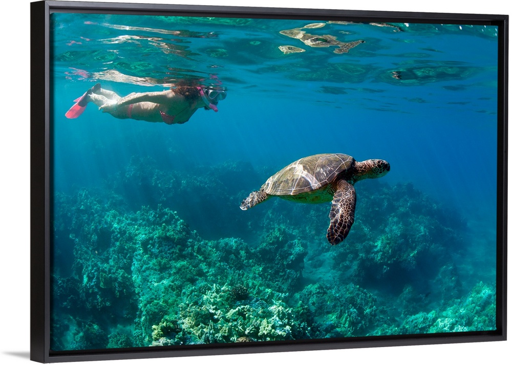<p>Woman snorkeling with sea turtle underwater over coral reef in Wailea, Maui, Hawaii, USA.</p>