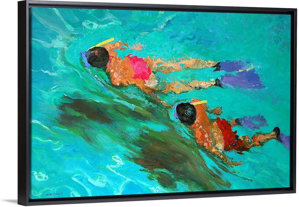 <p>Huge contemporary art shows a man and woman snorkeling through clear water. As the two people travel further in the water, the surrounding water ripples can be seen stemming from their movements.</p>